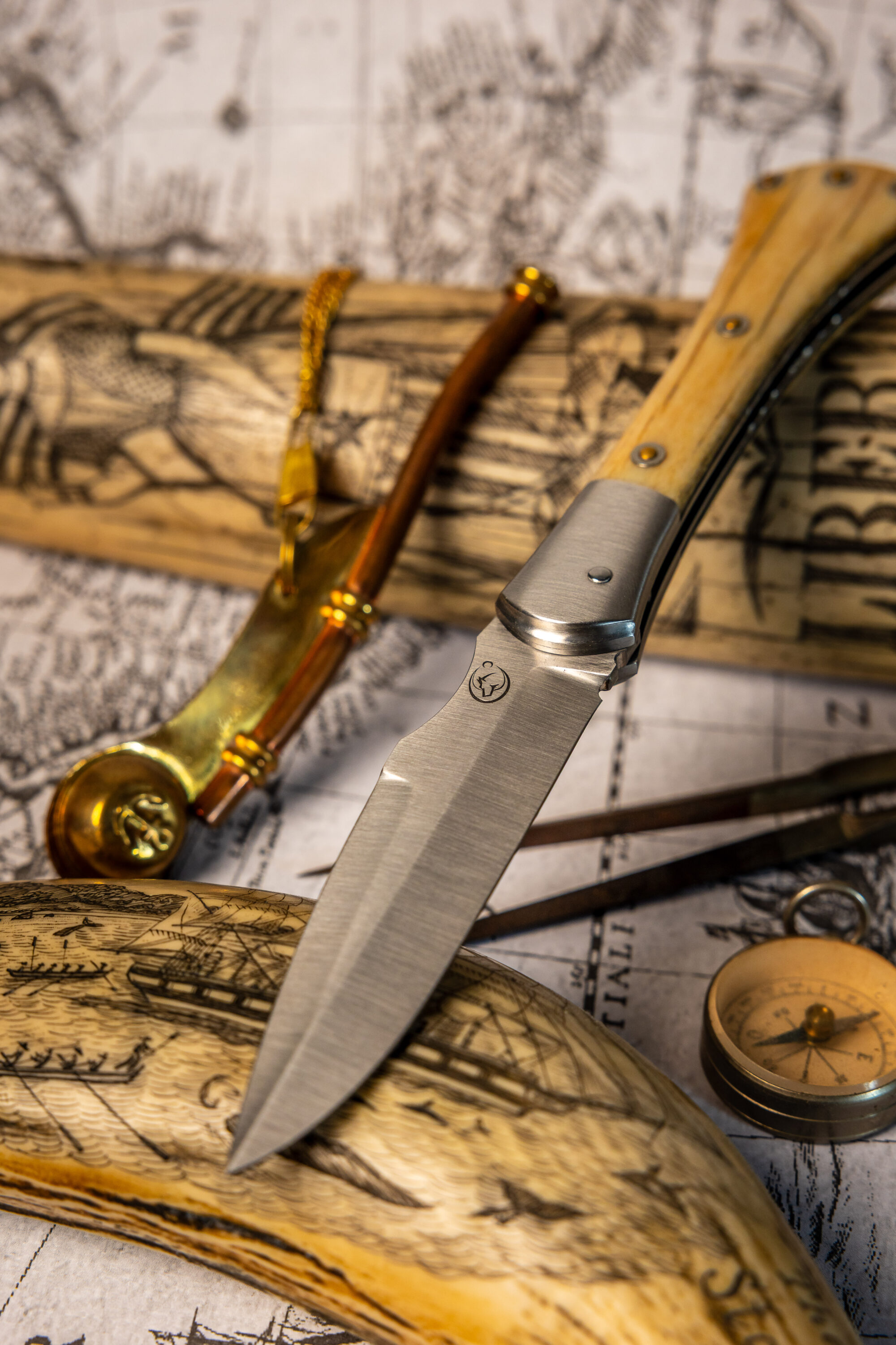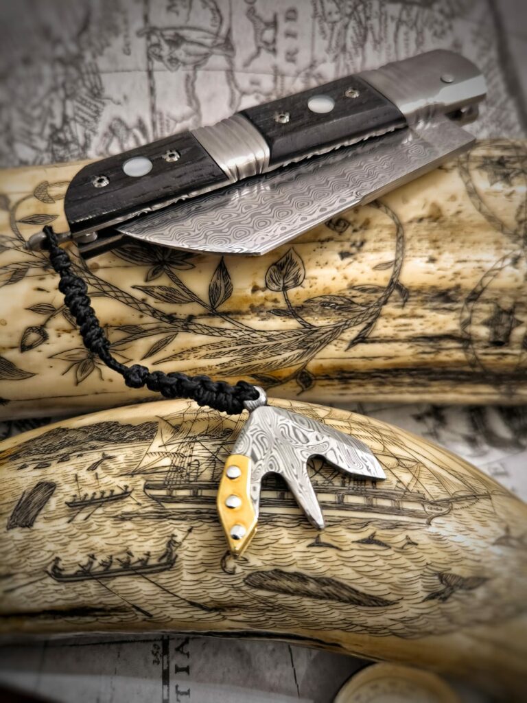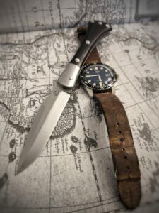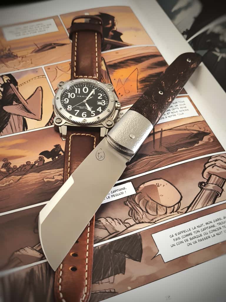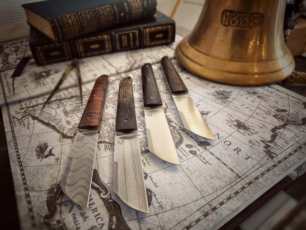 J’ai décidé de créer un couteau identitaire et local fabriqué dans mon atelier en Bretagne, ce couteau se nomme Achab, il est inspiré des plusieurs couteaux de marins et de bateliers, le London, le Seurre, mais aussi un petit couteau campagnard le Tiré-droit. Ce qui fait de lui un couteau à la fois marin et terrien… La subtile association de la Bretagne… Terre et mer, Armor et Argoat.